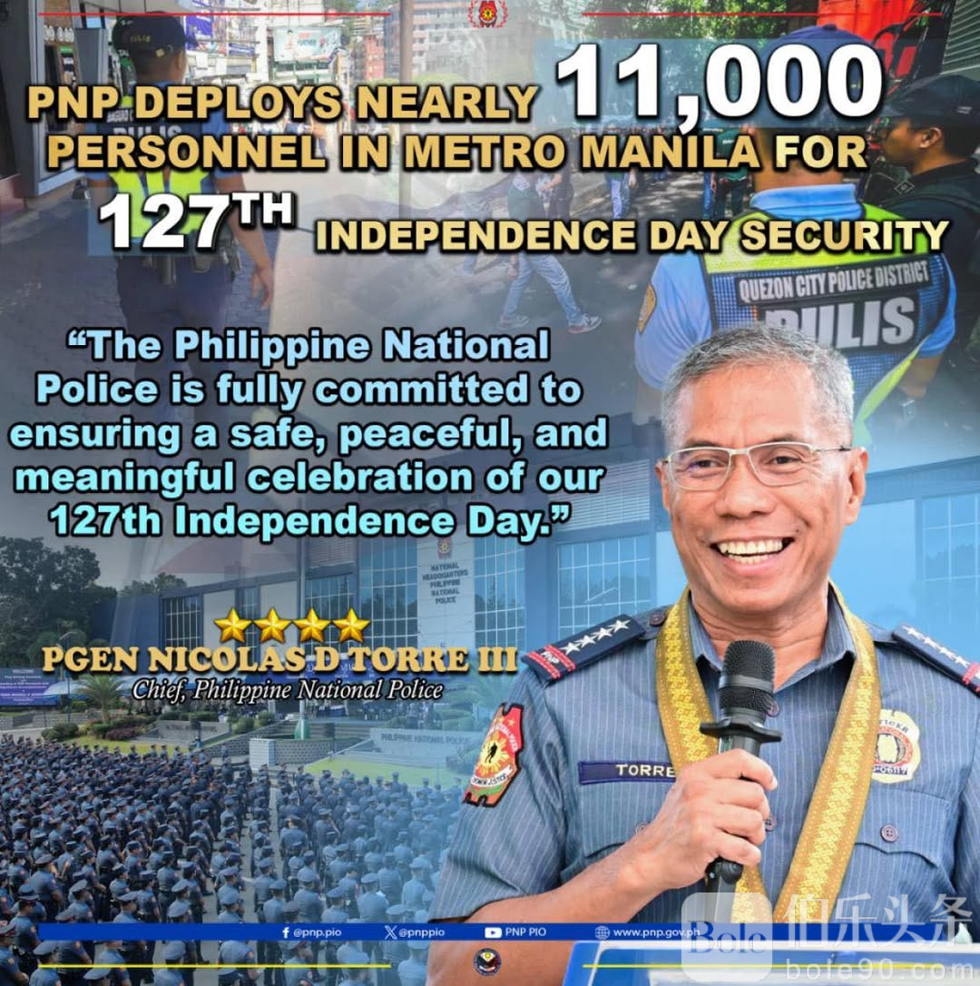 伯乐头条专讯:为确保第127届菲律宾独立日庆典安全顺利进行,菲律宾国家警察局(PNP)于6月12日出动近11,000名警员,在马尼拉大都会各地全面部署安保力量。