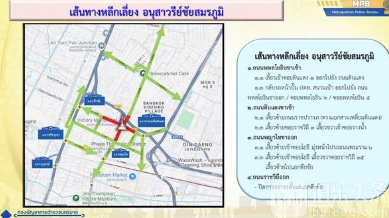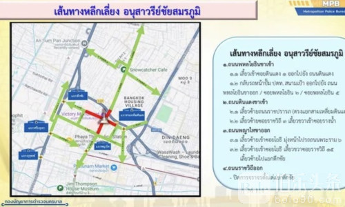 伯乐头条专讯:由于“人民民主联盟”(黄衫军)联合“人民民主改革委员会”、“反独裁民主联盟”、“红衫军”及多方社会团体,计划于6月28日(明日)在曼谷胜利纪念碑一带发起大型集会,京畿警察署今日(6月27日)紧急发布临时交通管制与绕行方案,提醒市民及游客务必提前规划路线,避免前往集会区域,以免遭遇严重拥堵或突发状况。