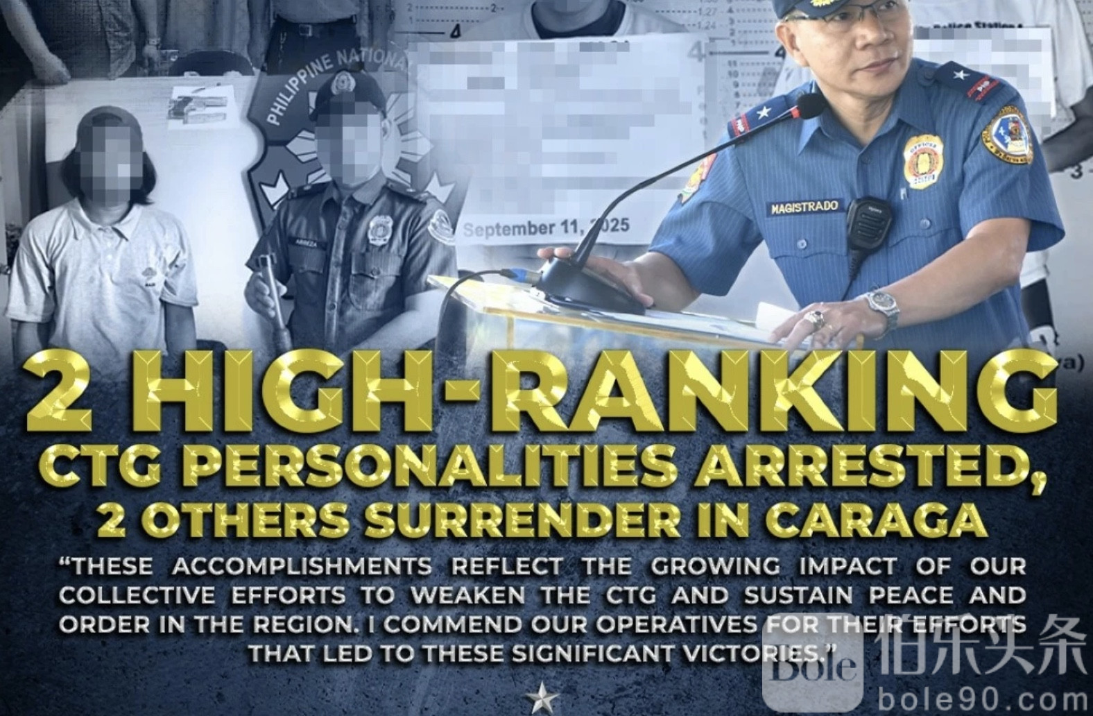 伯乐头条专讯:9月11日,菲律宾警方在阿古桑德尔苏尔及苏里高德尔苏尔成功抓获两名共产党菲律宾新人民军(CPP-NPA)高层领导人,重挫该地区反叛势力。警方正在对两人进行战术调查,以进一步查明犯罪网络及活动细节。