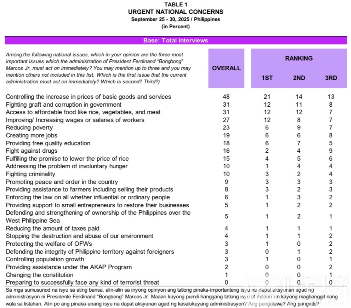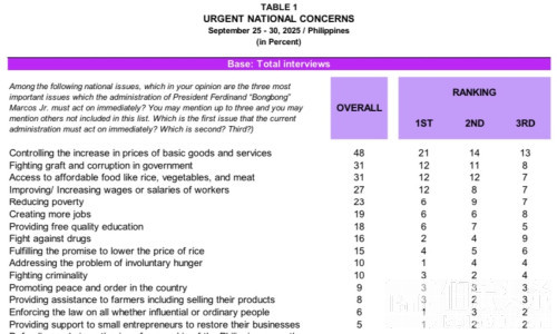 在菲律宾民众关注的国家议题中,物价上涨仍位列第一(48%),虽较7月的50%略有下降;“食品可负担性”与“工资水平”则分列第三、第四位,分别为31%与27%;“创造更多就业机会”排名第五,占比23%。