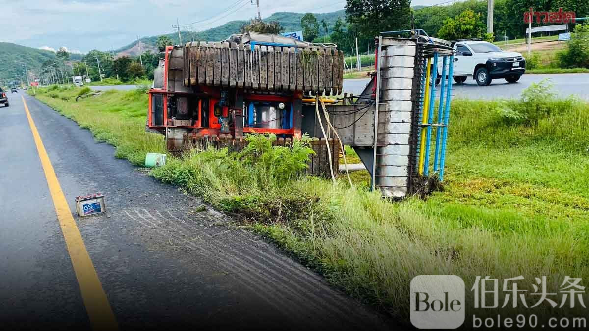 事故发生在Nakhon-Hua Sai公路的弯道处,现场可见翻倒的收割机及受伤人员和牛。当地警方初步调查认为,事故主要因卡车未减速驶入弯道导致货物滑落。相关责任人正在追查中。