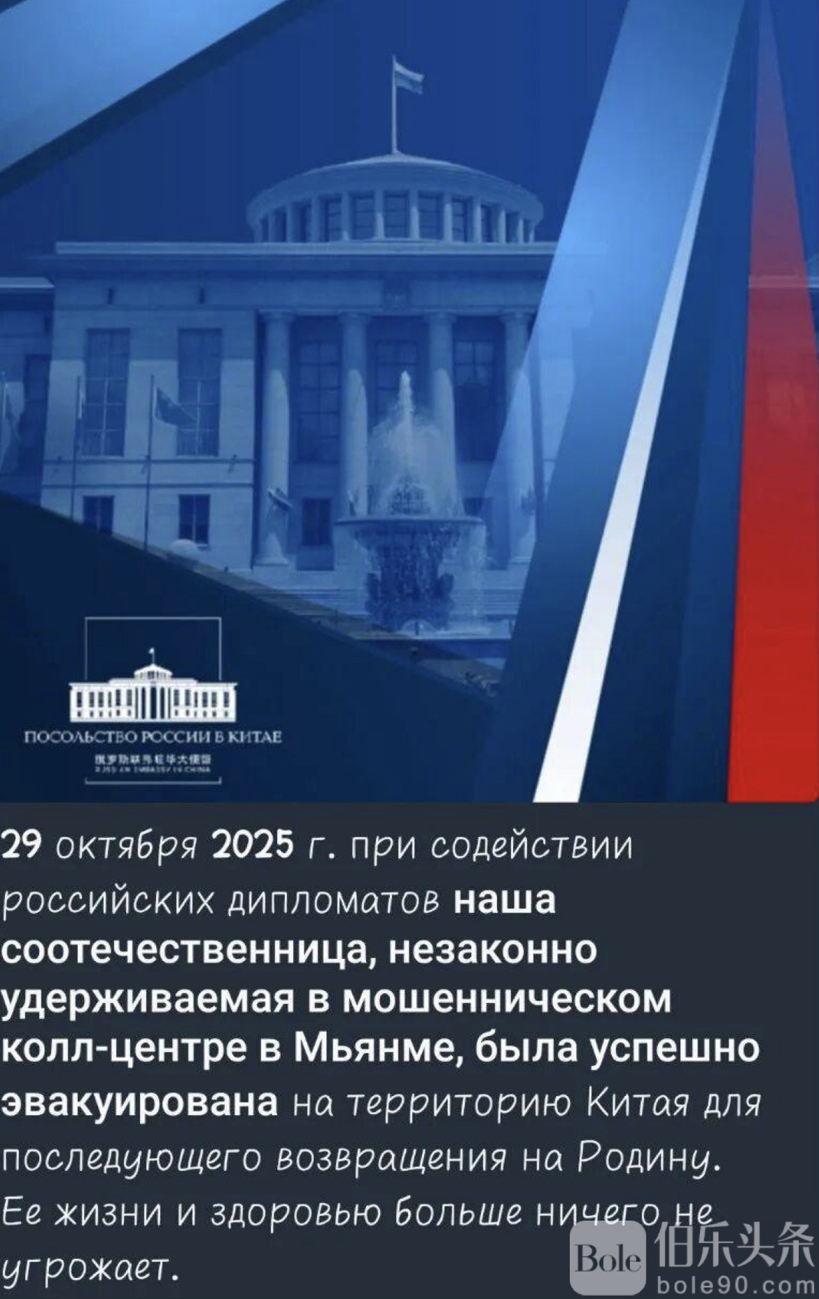 伯乐头条专讯:近日,俄罗斯驻华大使馆发布消息称,一名被非法拘禁在缅甸“电诈园区”的俄罗斯女子成功获救,并于10月29日经中国云南中转安全撤离。