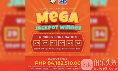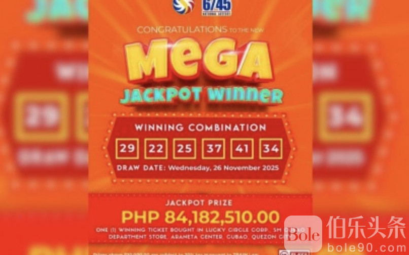 伯乐头条专讯:菲律宾一名大都会地区彩民在周三晚的Megalotto 6/45开奖中,独中PHP84,182,510.00头奖。根据菲律宾慈善抽奖办公室(PCSO)周四通报,这张中奖彩票由彩民在奎松市Cubao Araneta Center的SM Cubao百货店内Lucky Circle Corporation购得,正确猜中开奖号码组合为29-22-25-37-41-34。