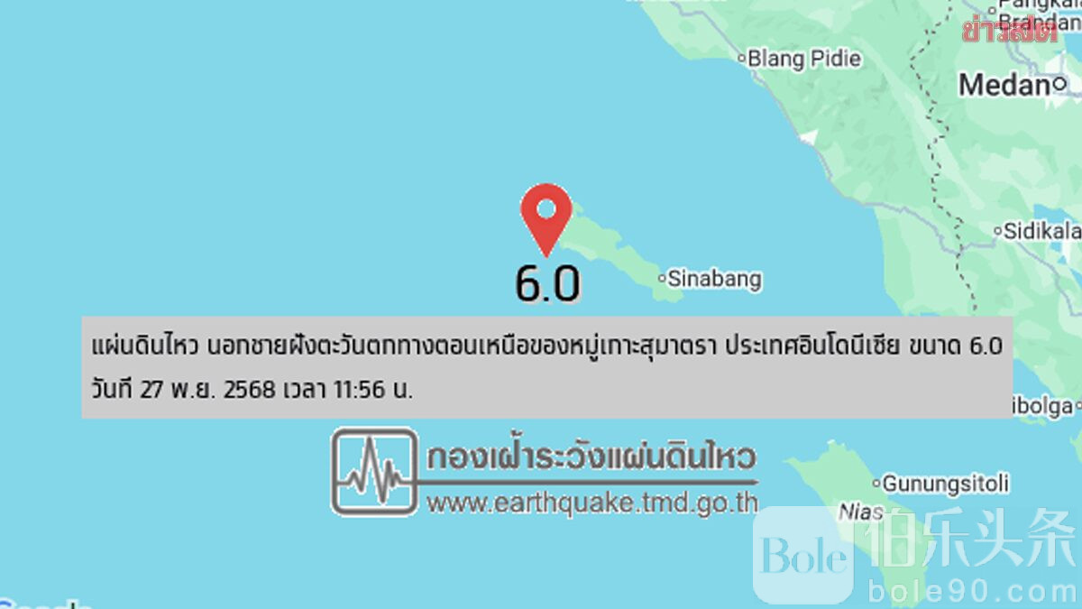 伯乐头条专讯:泰国地震监测中心于11月27日中午发布消息,印尼苏门答腊群岛北部外海于当地时间11时56分发生规模6级地震,震源深度约10公里。震中位置位于普吉府直辖县西南方向约661公里的海域。