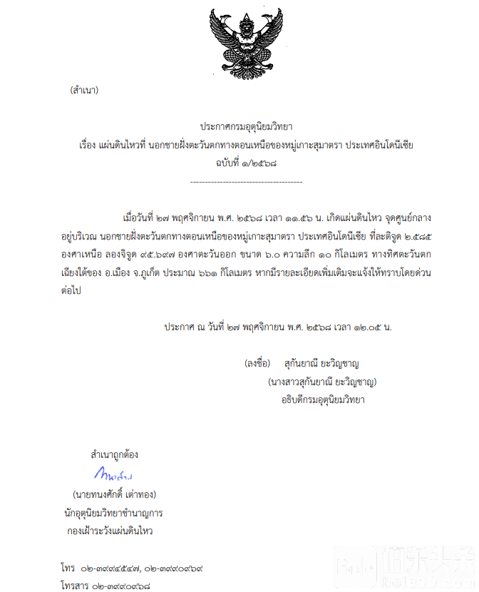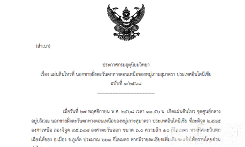 据泰国气象厅发布的第1号公告,地震发生在印尼北苏门答腊外海西侧,目前尚无泰国地区受影响的报告,各方正持续监测震情。若后续有更多相关信息,气象厅将立即对外发布。