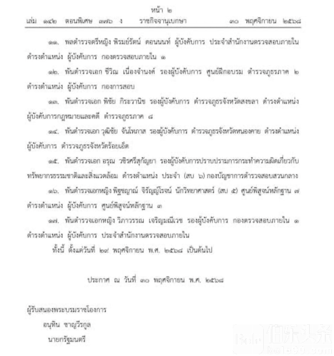 公告最后由泰国总理 阿努廷·查恩维拉谷(Anutin Charnvirakul) 作为“御令执行人”正式签署。此举象征本次人事调整已全面生效,影响涵盖全国警局体系即时运作。