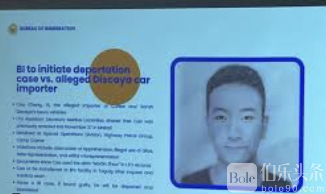 伯乐头条专讯:菲律宾移民局(BI)12月3日宣布,一名中国籍男子曹诚(Cao Cheng,又名 Martin Zhao)因涉嫌为知名承包商 Discaya 夫妇进口多辆豪车,现已被正式列入驱逐程序。
