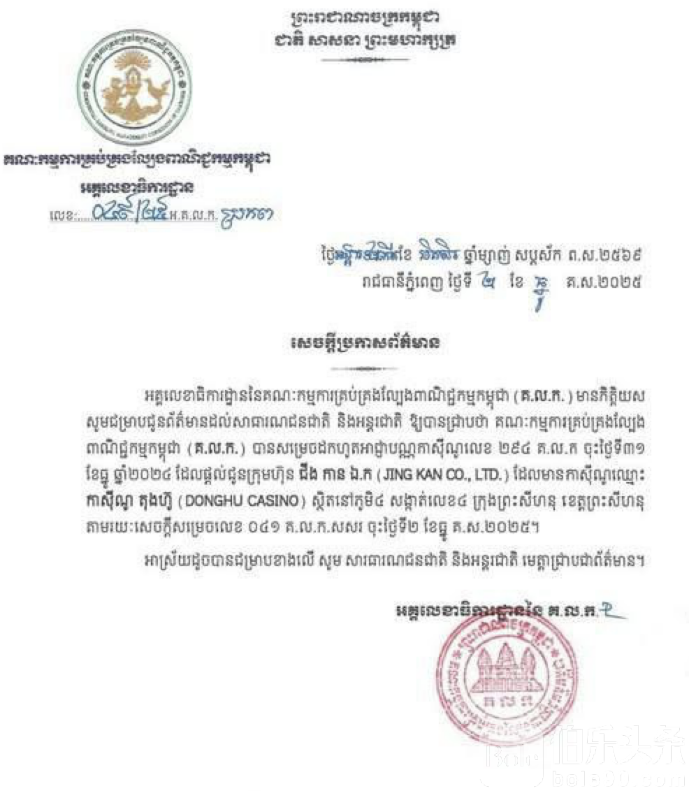 伯乐头条专讯:柬埔寨商业博彩管理委员会12月2日正式宣布,位于西哈努克市第4分区4村的“东湖赌场”因严重违规经营,被立即吊销营业执照,相关业务全面停止。消息一出,随即在当地华人圈与网友间引发强烈关注。
