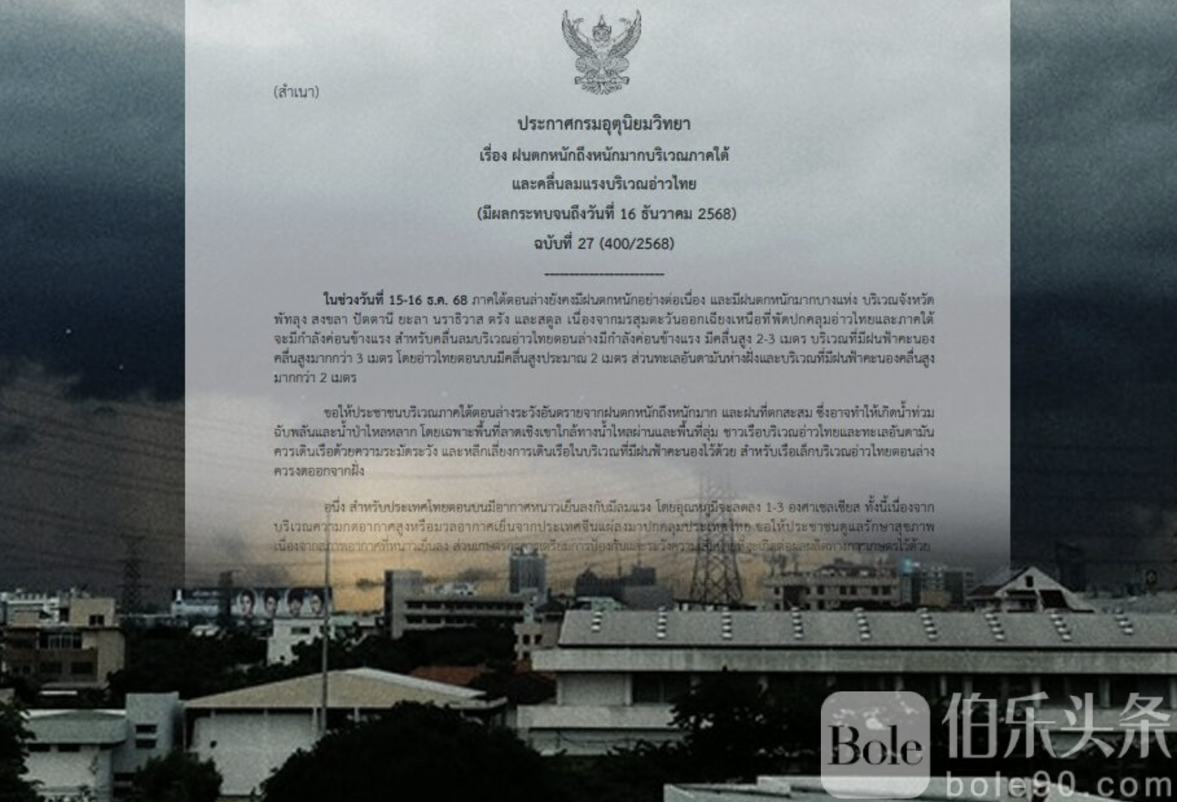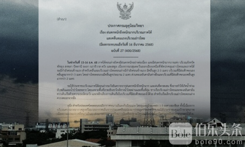 伯乐头条专讯:12月15日,泰国气象局发布第27号预警,警告南部多省将出现暴雨至大暴雨,沿海及高地地区需防范山洪和突发洪水。受强烈东北季风影响,泰国南部帕塔卢、宋卡、巴塔尼、雅拉、那拉提瓦、吞武里及素叻等省降雨量显著增加,部分地区暴雨尤为严重。