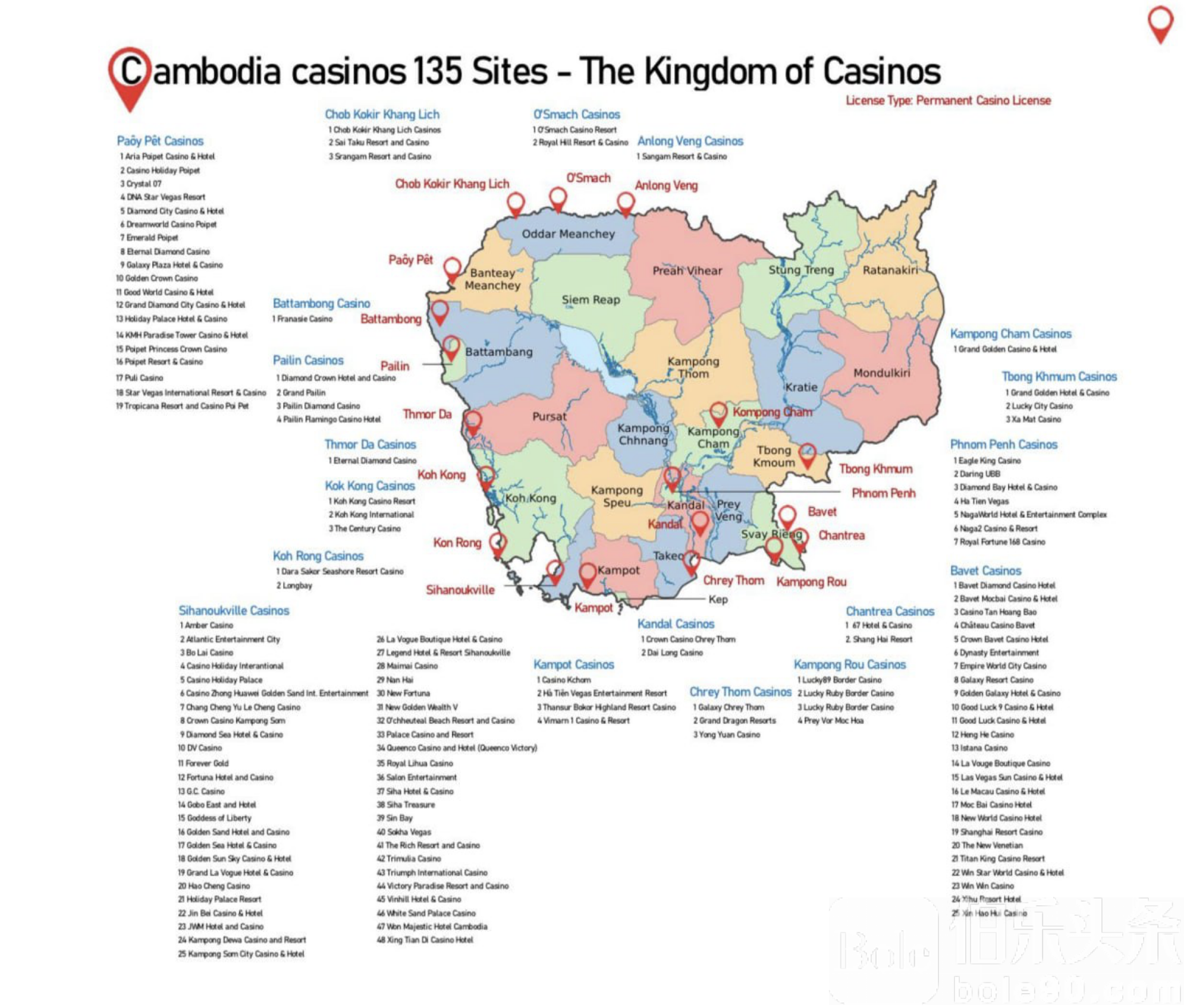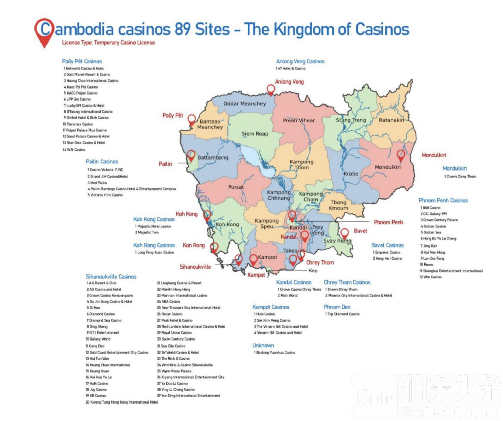 伯乐头条专讯:柬埔寨博彩业密度之高再次引发关注,截至2025年官方数据,全境共有250张各类赌场及博彩牌照,其中包括135个正式赌场牌照、89个临时赌场牌照、18个博彩经营牌照及2个临时博彩牌照。