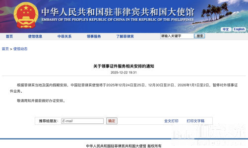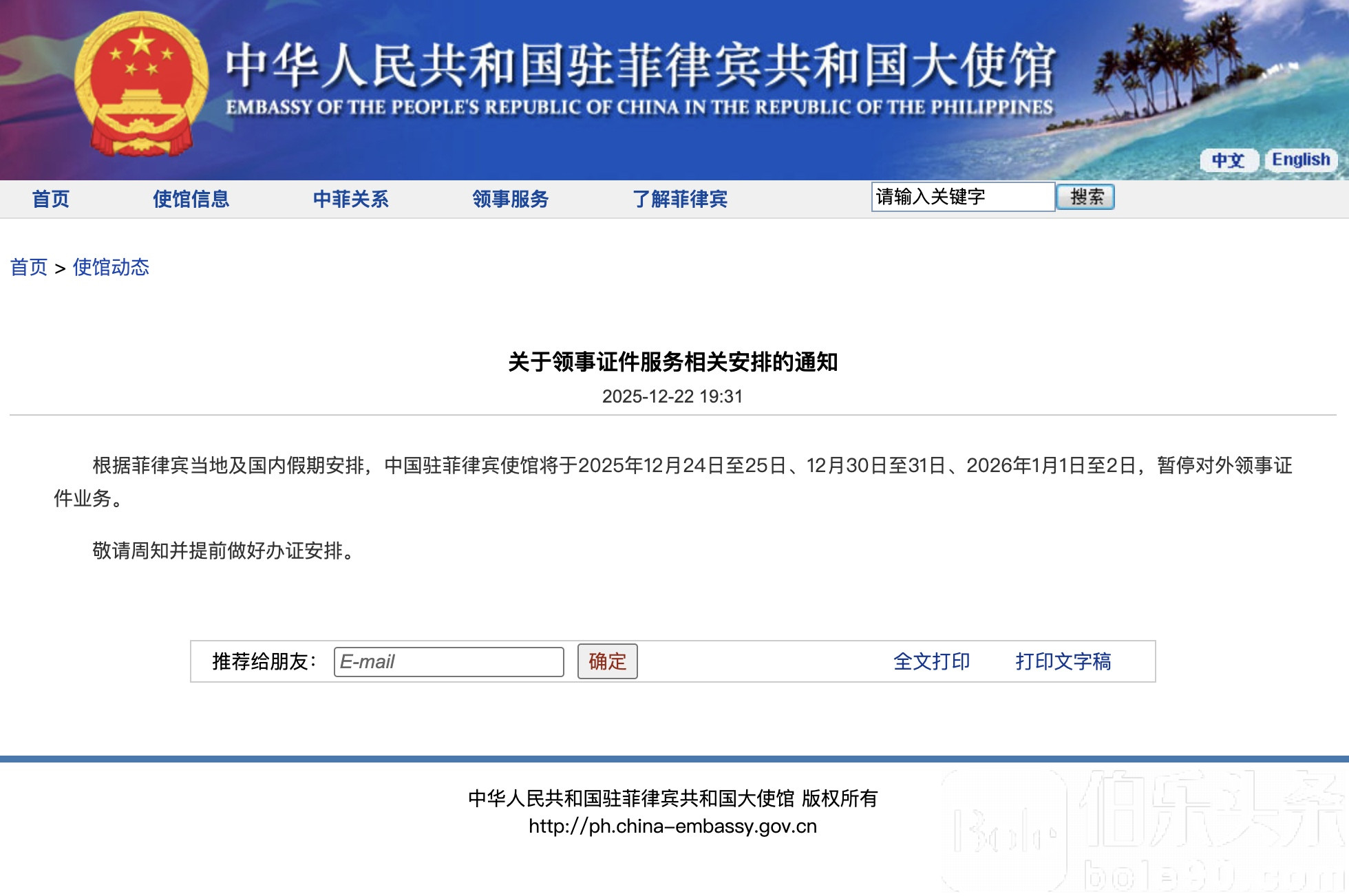 伯乐头条专讯:中国驻菲律宾大使馆近日发布提醒,因配合菲律宾当地及中国国内假期安排,使馆将于多段时间暂停对外办理领事证件相关业务,计划近期办理证件的在菲同胞需提前做好安排。
