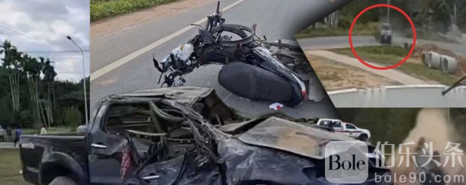 伯乐头条专讯:泰国奈空他信府1月11日发生一起惨烈交通事故,一辆皮卡车在弯道失控撞上一对夫妻骑乘的摩托车,造成现场2人当场死亡,皮卡车司机送医后不治,事故共造成3人死亡。