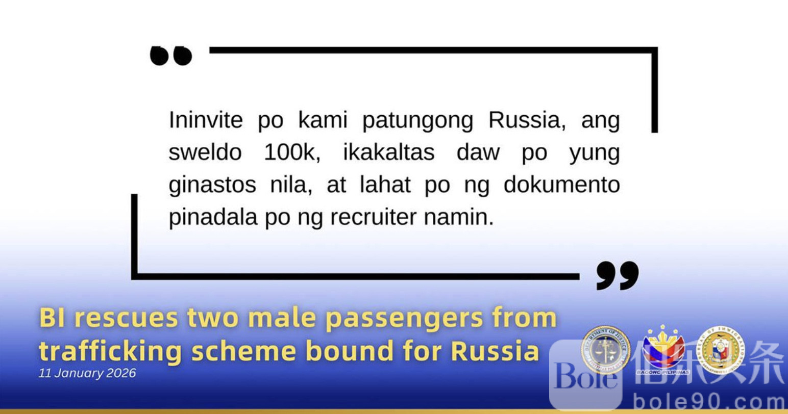 伯乐头条专讯:菲律宾移民局(BI)日前在马尼拉尼诺·阿基诺国际机场(NAIA)3号航站楼成功拦截并救助两名男性旅客,及时阻止了一起疑似跨国人口贩运案件。这两名男子原本计划经香港转机,最终前往俄罗斯非法务工,所幸在登机前被执法人员识破。