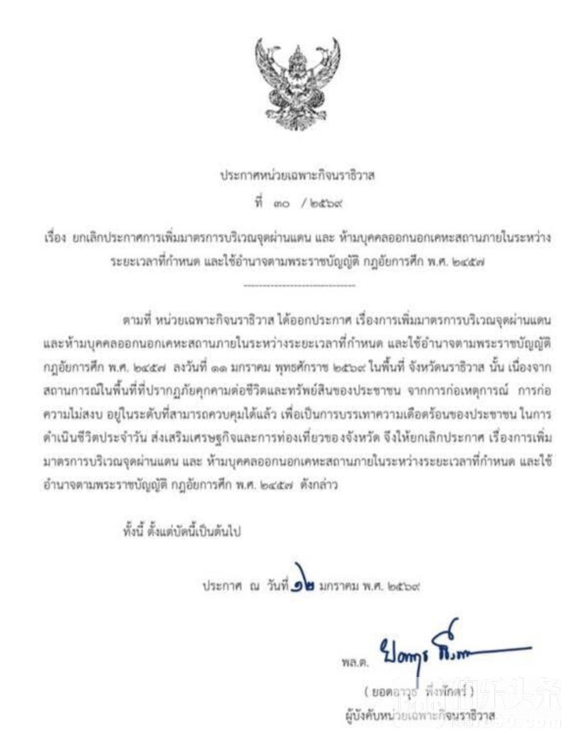 根据通报,1月12日,那拉提瓦府特别行动指挥单位发布公告,宣布取消此前依据《戒严法》实施的人员外出限制措施(宵禁),以及在部分口岸和重点区域加严的安全管控。该公告自发布之时起立即生效。