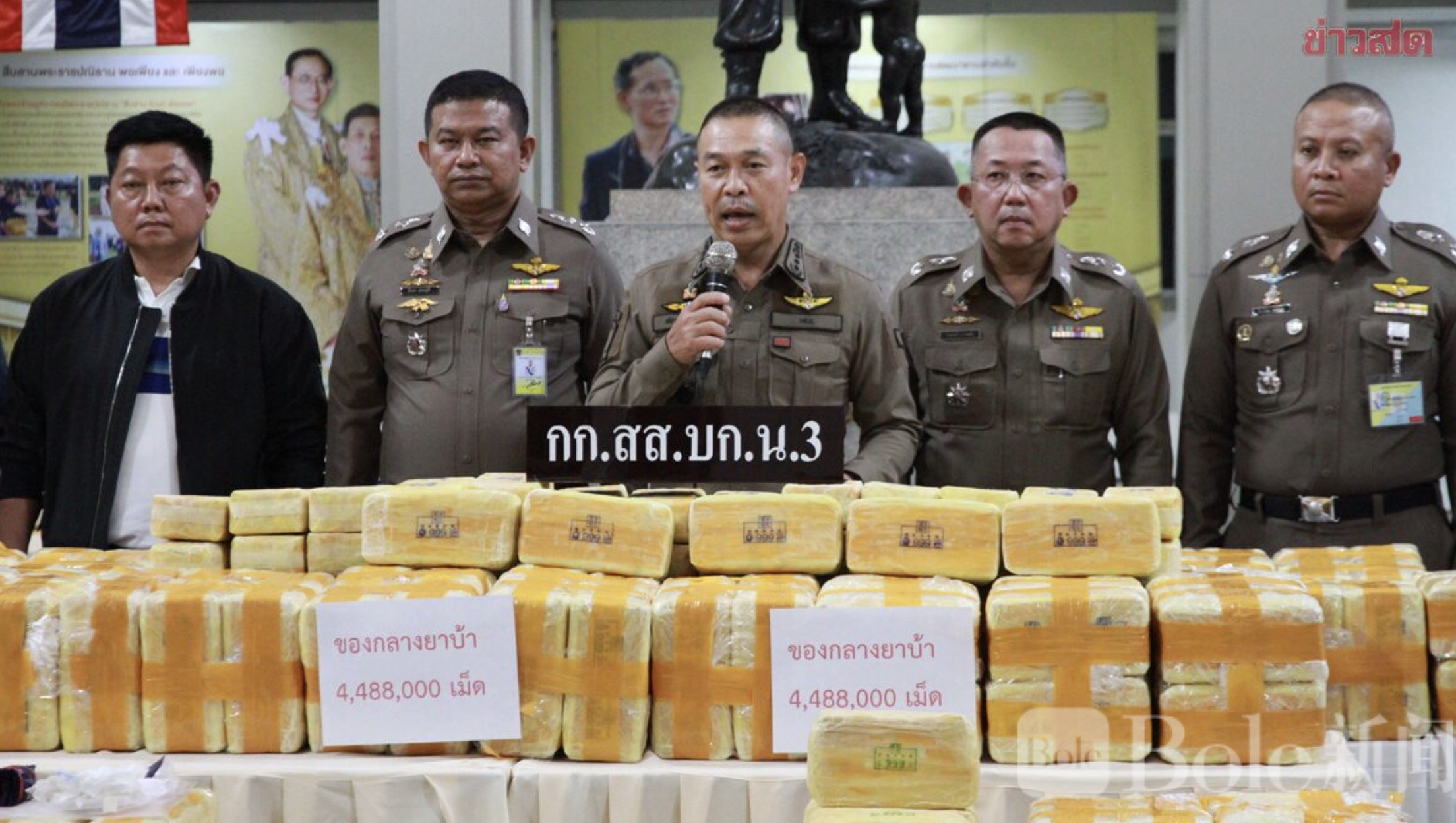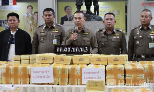 Bole新闻专讯:曼谷警方第三侦查分局(บก.น.3)11日下午突袭农乔区一处住宅,成功抓获29岁的毒品嫌疑人庞萨通(Pongsathon),现场缴获冰毒(甲基苯丙胺)总计4,488,000颗及一部手机。此次行动源于线人举报,指称有人在农乔区经营毒品交易,并将大批冰毒藏匿于住宅中,再分批通过街道交付给客户。
