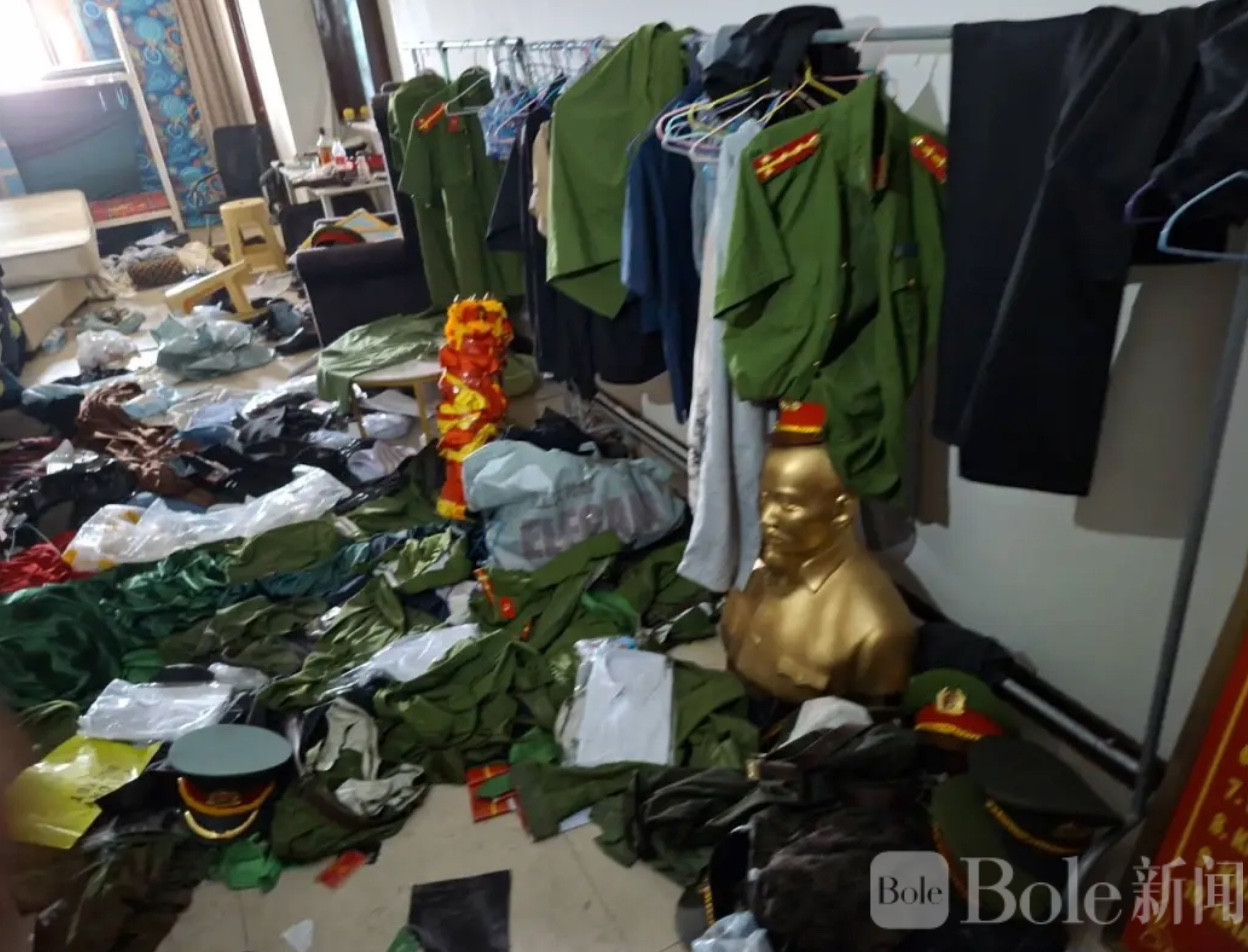 在实地考察中,媒体被带入A栋六层建筑内部,原本设计为客房的空间被改造为多个“警局办事处”,伪装成越南、印尼、印度、新加坡、中国等国的警察机构。现场甚至悬挂国旗、摆放前领导人塑像,并配备制服与帽具,专门用于行骗。工作人员向媒体展示了近期获取的多国受害者名单和联系方式,堆积如山,让人触目惊心。