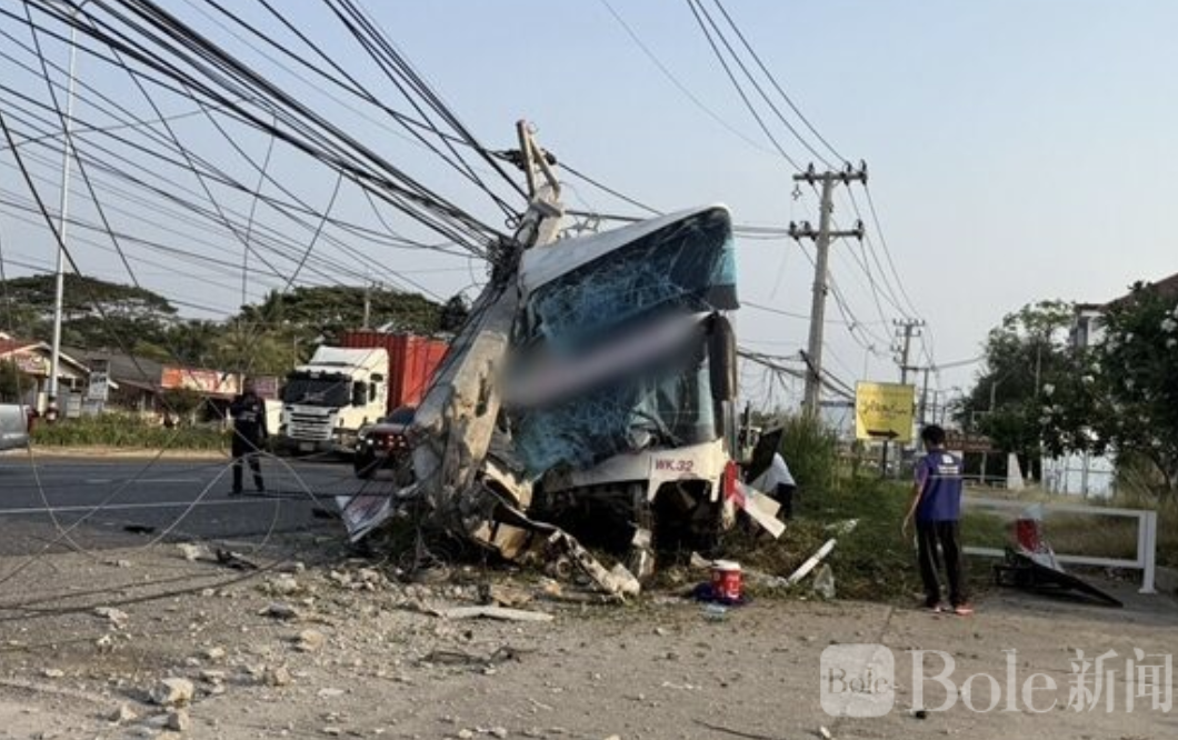 Bole新闻专讯:泰国碧武里府今晨发生一起严重交通事故,一辆载有乘客的长途大巴在行驶途中突然失控,猛撞路边电线杆,造成大量乘客受伤,现场一片狼藉。
