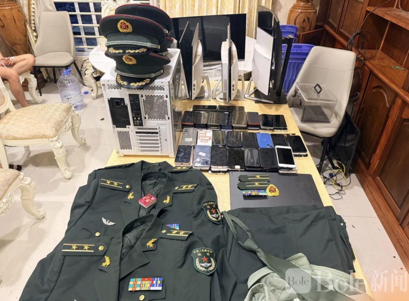 行动地点位于当地一处被称为“炳发城”的区域。警方在现场查获大量疑似作案工具,包括制作精良的假军装、肩章及勋表等装备,还有多台电脑及通信设备,以及一批尚未拆封的新手机,疑似用于批量注册和操作多个账号。