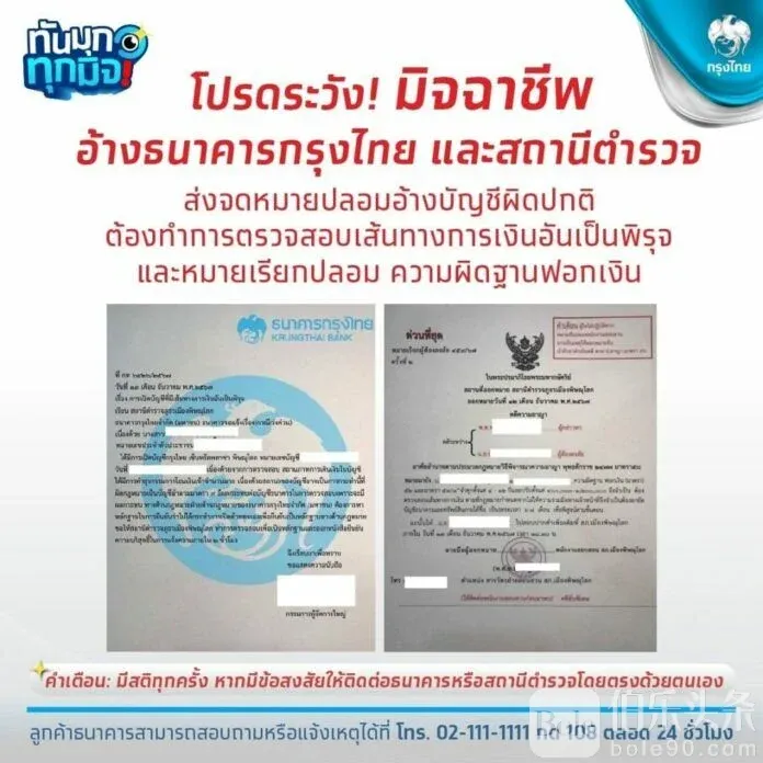 昨天(12月13日)泰国Krungthai银行通过其官方Facebook页面“Krungthai Care”发布了一则重要声明,揭露骗子通过发送伪造信件和文件来欺骗客户。这些信件通常伪装成来自银行或警方的官方通知,内容声称客户账户存在违规行为或涉嫌洗钱犯罪,要求客户配合调查并提供个人信息或转账。