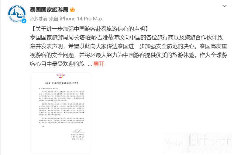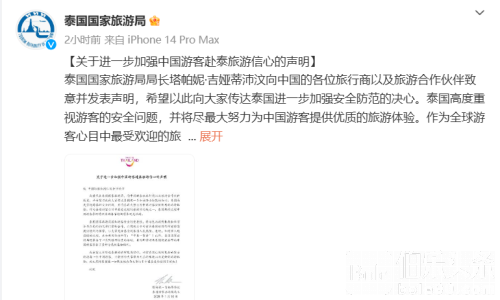 “我谨代表泰国国家旅游局,向中国的各位旅行商以及旅游合作伙伴致意,并希望以此向大家传达泰国进一步加强安全防范的决心。泰国高度重视游客的安全问题,并将尽最大努力为中国游客提供优质的旅游体验。作为全球游客心目中最受欢迎的旅游目的地之一,泰国热忱欢迎中国游客在即将到来的春节期间前来观光旅游。”