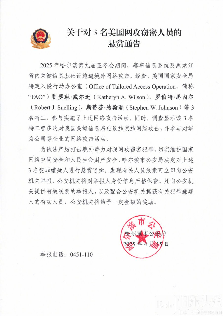 伯乐头条专讯:中国黑龙江省哈尔滨市官方通报,悬赏通缉涉网攻窃密的三名美国特工。