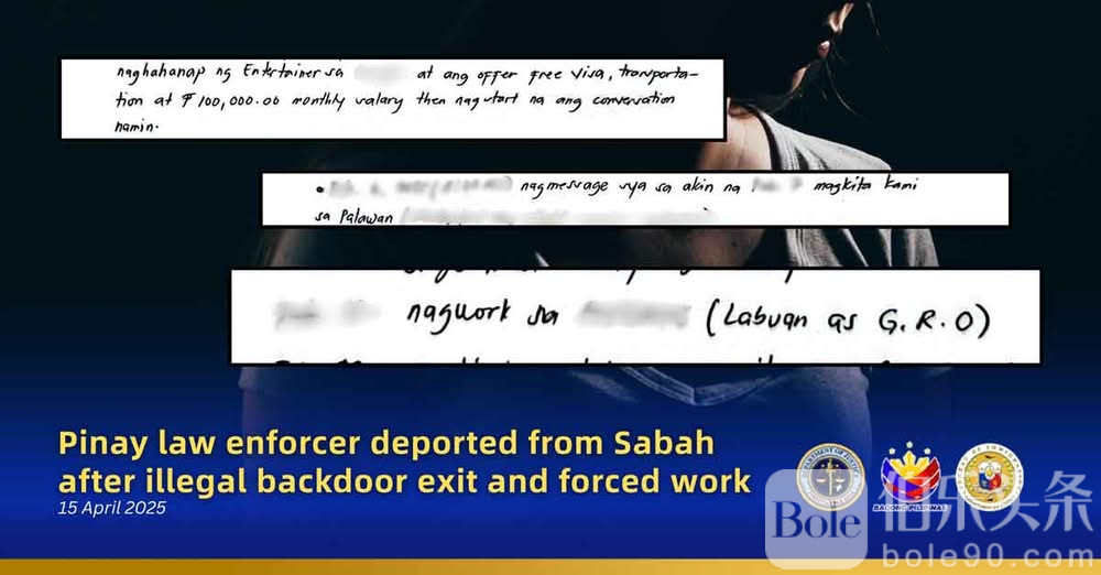 伯乐头条专讯:一名前菲律宾女性执法人员近日因非法入境及被强迫劳务而遭马来西亚政府遣返回国。菲律宾移民局透露,该女子透过非法途径进入沙巴,在当地被迫从事表演工作,后被马国警方解救。