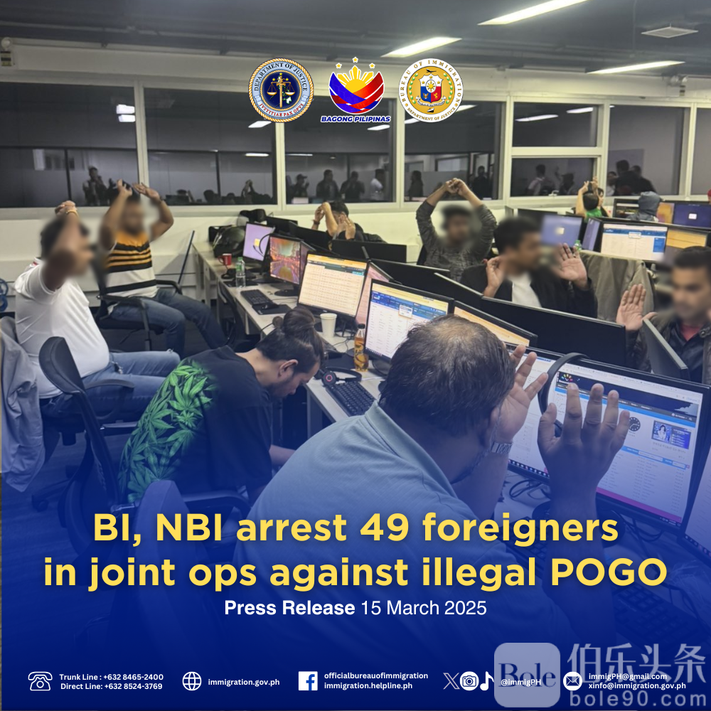 2025年3月14日,菲律宾移民局(BI)与国家调查局(NBI)联合突袭帕赛市Macapagal大道一栋商业大楼,逮捕了49名外国人。这些人被发现从事网络诈骗活动,伪装成合法的数字服务和在线营销公司运营。其中两人有不良记录,一人为涉嫌非法招聘的孟加拉籍男子,另一人为涉及金融诈骗的巴基斯坦籍男子。所有被捕人员将面临遣返和黑名单处理。