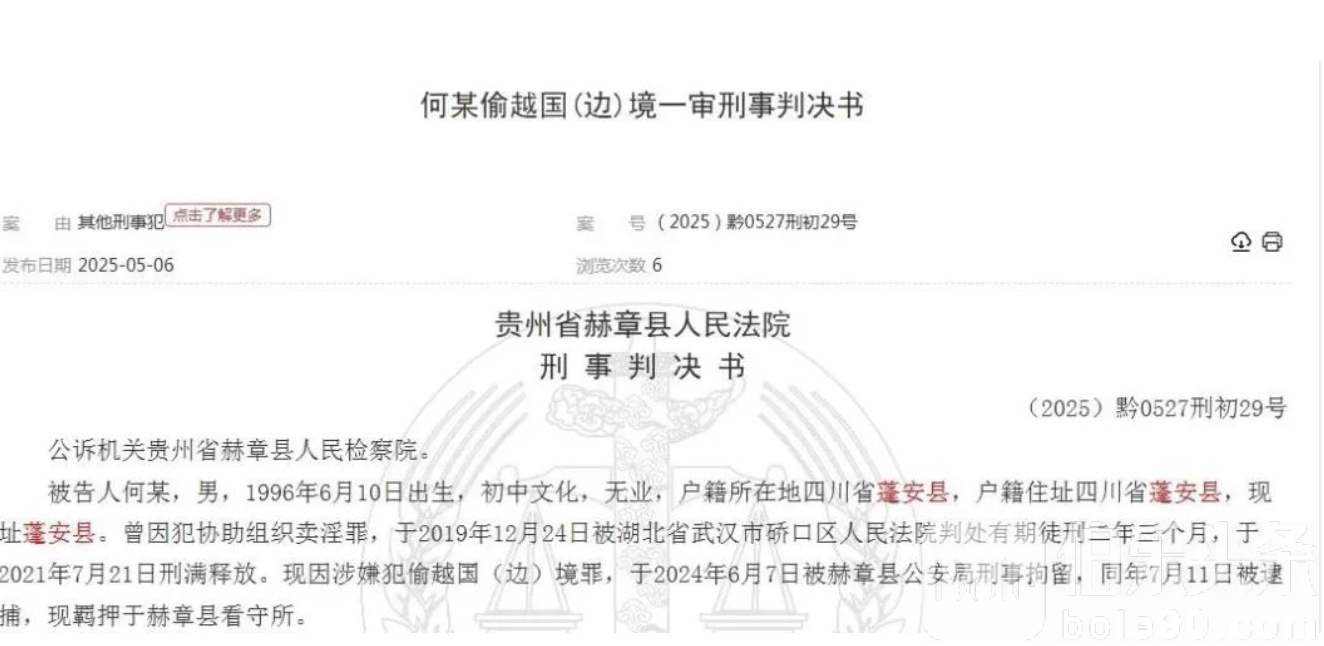 伯乐头条专讯:贵州一名前科男子不顾法律红线,企图靠“背黄金”赚快钱,结果再次踏上违法道路。2025年5月6日,贵州省赫章县人民法院对一起非法出入境案作出一审判决,被告人何某因偷渡至老挝参与黄金走私,被依法判处有期徒刑十个月,并处罚金人民币两千元。
