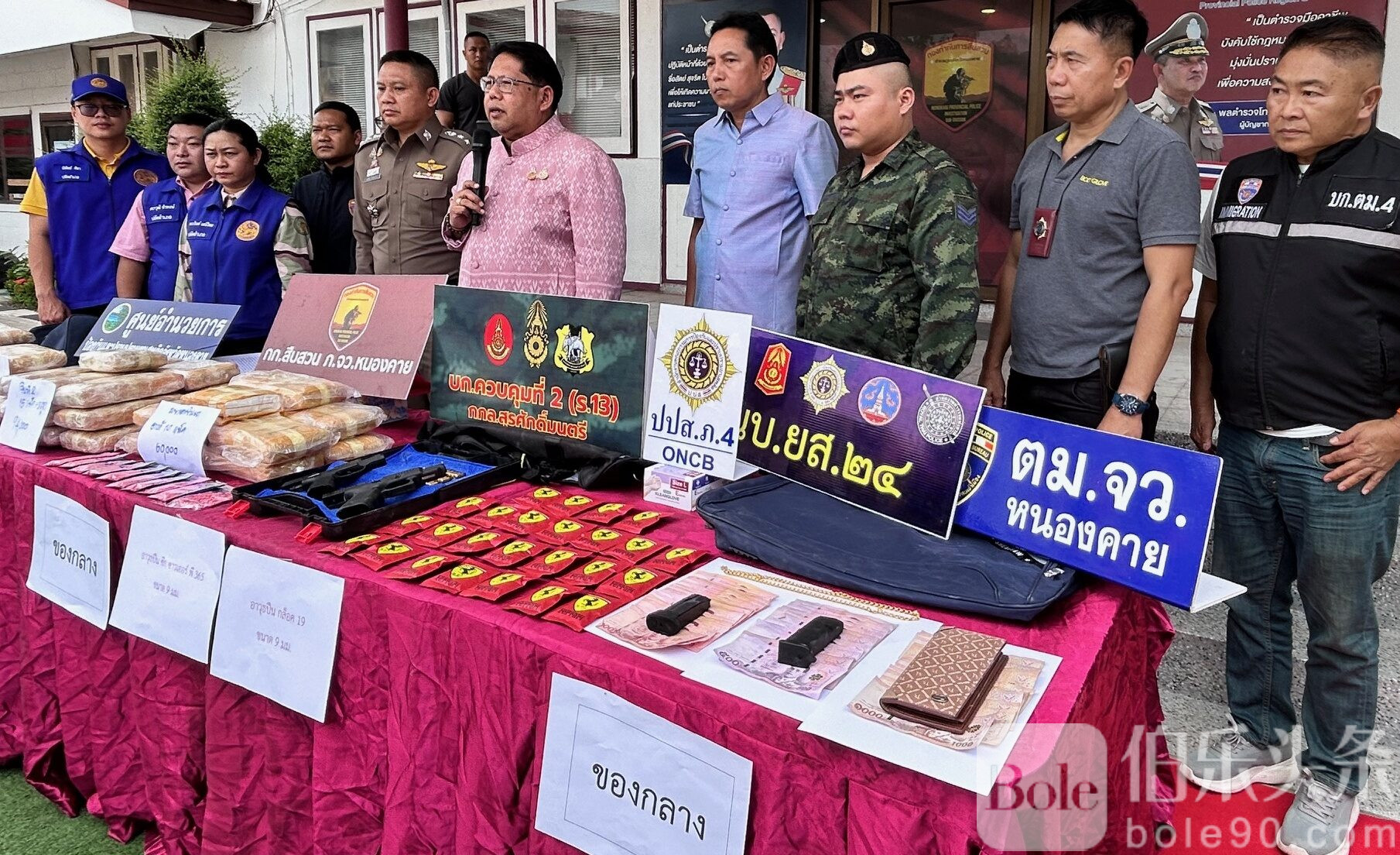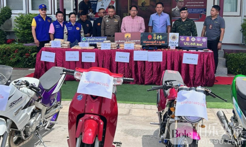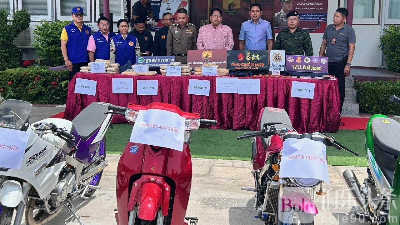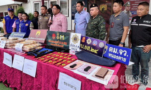 伯乐头条专讯:6月3日,泰国廊开府警方在一次联合突袭中逮捕两名贩毒嫌疑人。这两名男子原试图驾车逃避追捕,结果车辆失控撞树,最终被当场抓获。警方在其车内和出租屋中缴获大量毒品、枪支及涉案财物。