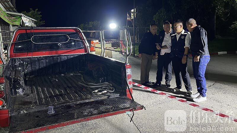随后,一辆红色五十铃皮卡车(车牌Bon 7297 Pathum Thani)载着伤者紧急前往拉仑凯奥医院,但令人震惊的是,枪手竟然骑着白色本田Wave摩托车尾随而至,在医院门口再次开火,将已受伤的两人彻底击毙。