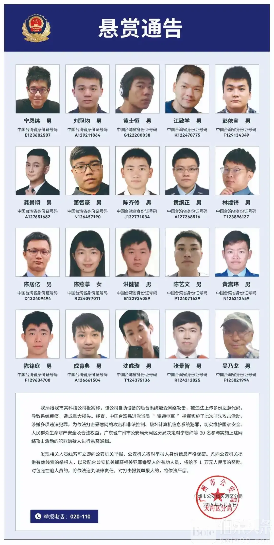 伯乐头条专讯:广州市公安局天河区分局6月5日正式发布悬赏通告,通缉涉嫌参与针对大陆网络攻击的20名台湾籍黑客组织核心成员。此次通缉行动针对台湾民进党当局主导的“资通电军”网络渗透行为,公安机关呼吁民众积极提供线索,并对每名被通缉人员设立1万元人民币悬赏。