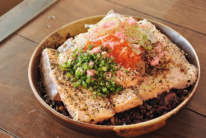 除了撒上青葱与丝状吉士作为装饰外,作为基底的紫米饭下方,更刷上甜咸甜咸的酱汁作为整道菜的调味,