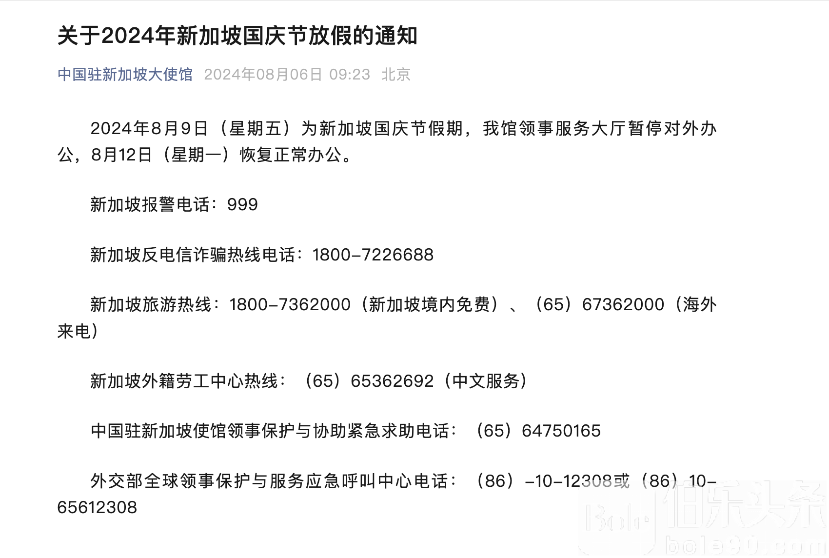 新加坡大使馆发布:关于2024年新加坡国庆节放假的通知