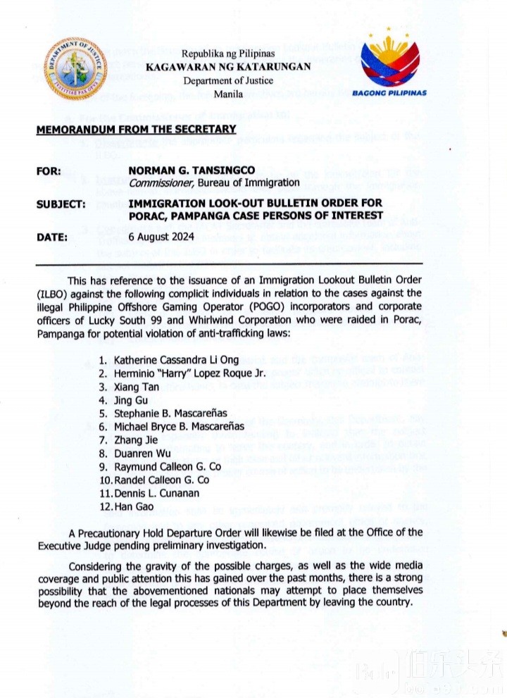 根据公告,这12人涉嫌参与非法的菲律宾离岸博彩运营。司法部表示,这些人可能会试图通过离开该国"使自己免受法律程序的约束"。