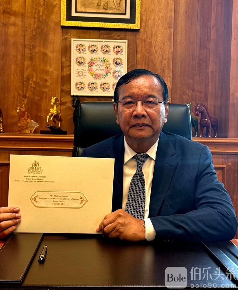 他指出,6月15日当天,柬副首相兼外交与国际合作部长布拉索昆已向国际法院提交正式信函。照片显示,布拉索昆手持该信函,背景庄重严肃。