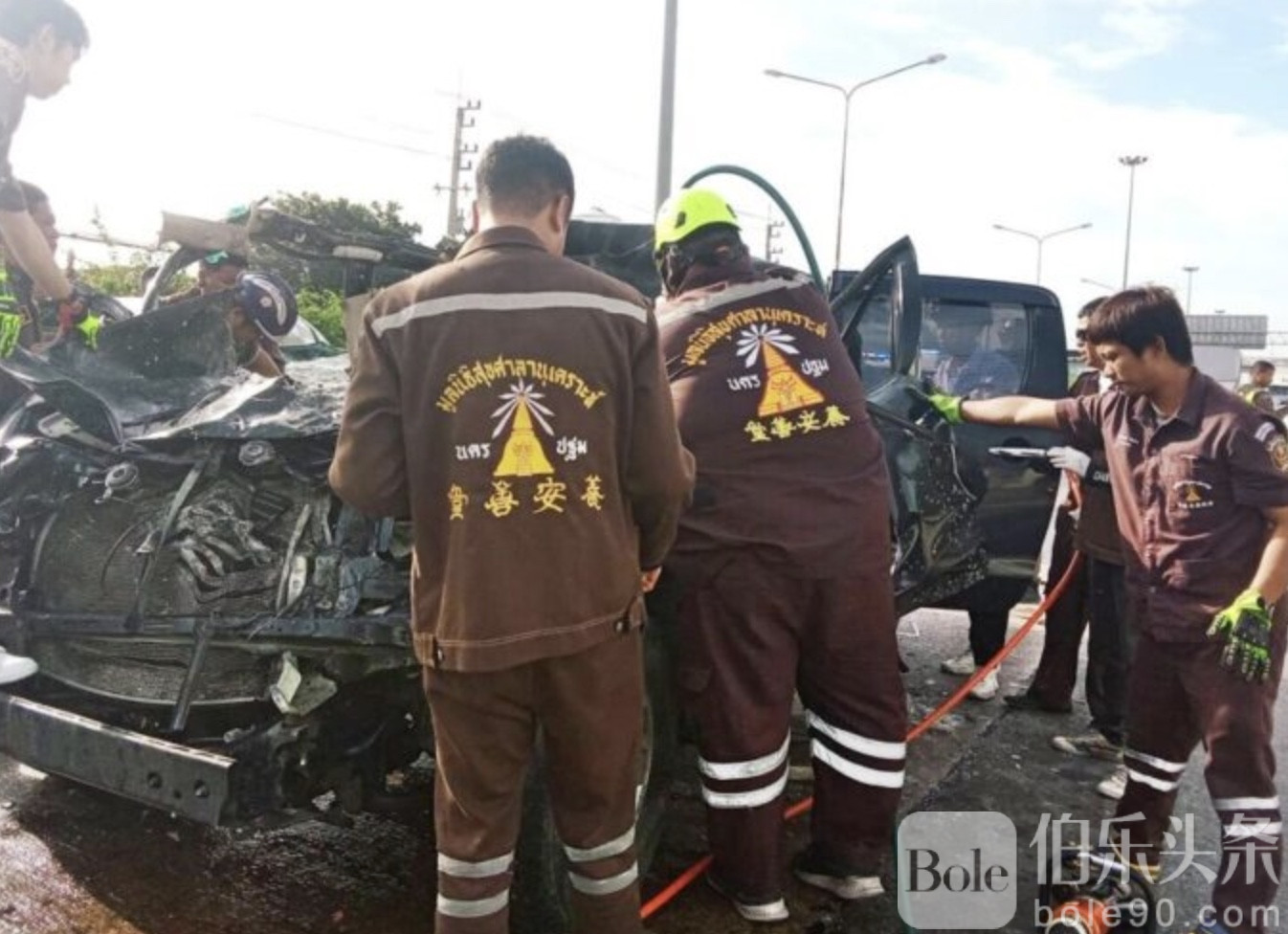 现场发现一辆青铜色的丰田Vigo四门皮卡车,车头严重损毁,堵在马路中间,车内司机当场被困。救援人员使用切割设备将司机救出,但送医后仍不幸身亡,副驾驶的41岁Siriporn女士则重伤送往Nakhon Chai Si医院抢救。