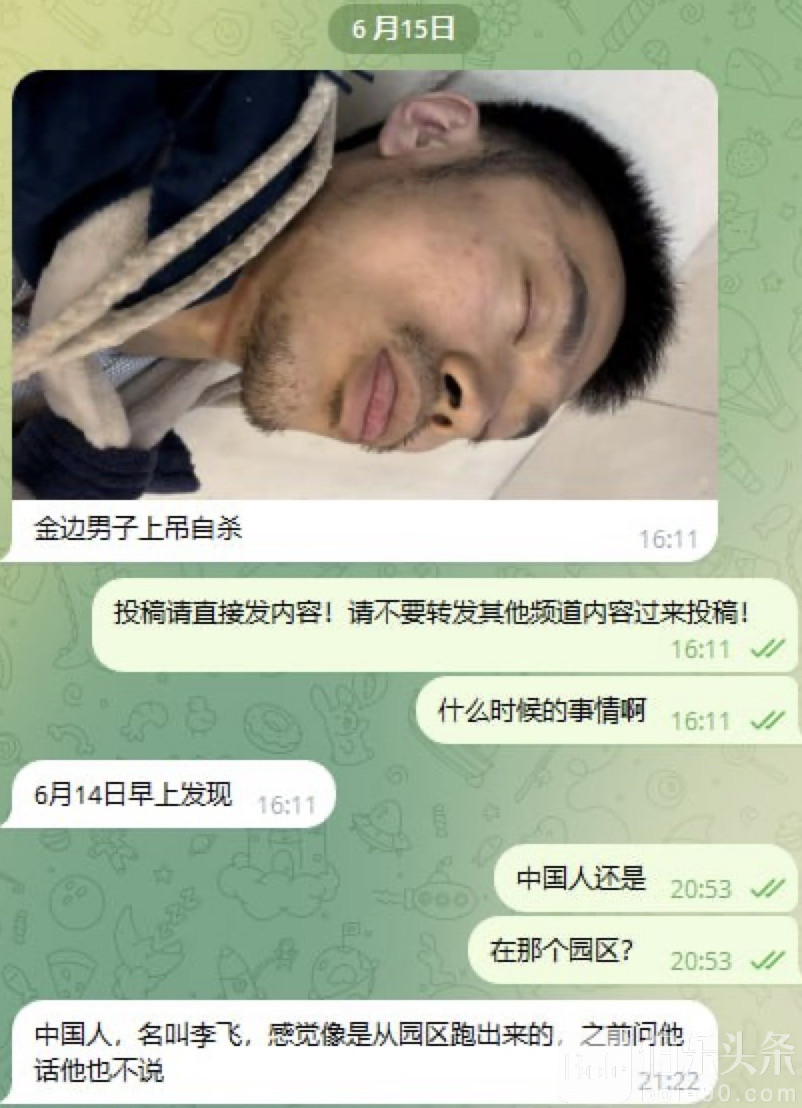 伯乐头条专讯:近日,柬埔寨传出一则令人痛心的消息。一名中国男子被发现上吊身亡,疑似是从某黑园区逃出来的务工人员。知情者透露,这名男子自称叫李飞,没有护照,身上仅带有一张中国身份证。六月初第一次现身时,他赤裸上身、衣衫褴褛,神情警惕,不愿多说话。