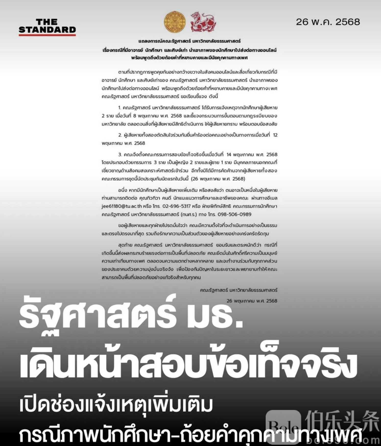 伯乐头条专讯:泰国知名高校法政大学(Thammasat University)惊曝丑闻!该校政治科学学院一名教授,竟与学生、校友共同参与一个私人线上聊天群,在群内公然发布女学生照片,并配以露骨性暗示及羞辱性言论,引发舆论哗然。