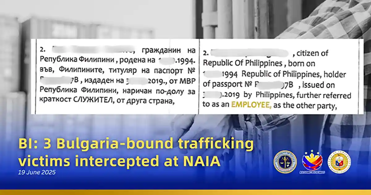 伯乐头条专讯:菲律宾移民局于2025年6月14日,在尼诺·阿基诺国际机场(NAIA)1号航站楼成功拦截三名企图出境的菲律宾女性,怀疑她们为非法招聘及人口贩运的受害者,目的地最终疑指向欧洲国家保加利亚。