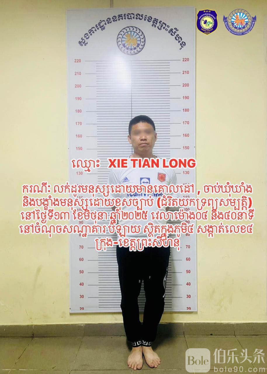 伯乐头条专讯:柬埔寨西哈努克省警方6月22日成功逮捕一名中国籍男子谢天龙,涉嫌非法拘禁3人并勒索高达4.5万美元的赎金。目前,该案已移交西哈努克省初级法院进入司法程序,案件仍在进一步调查中。