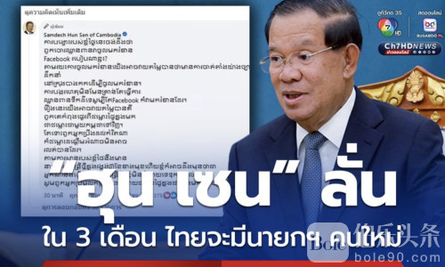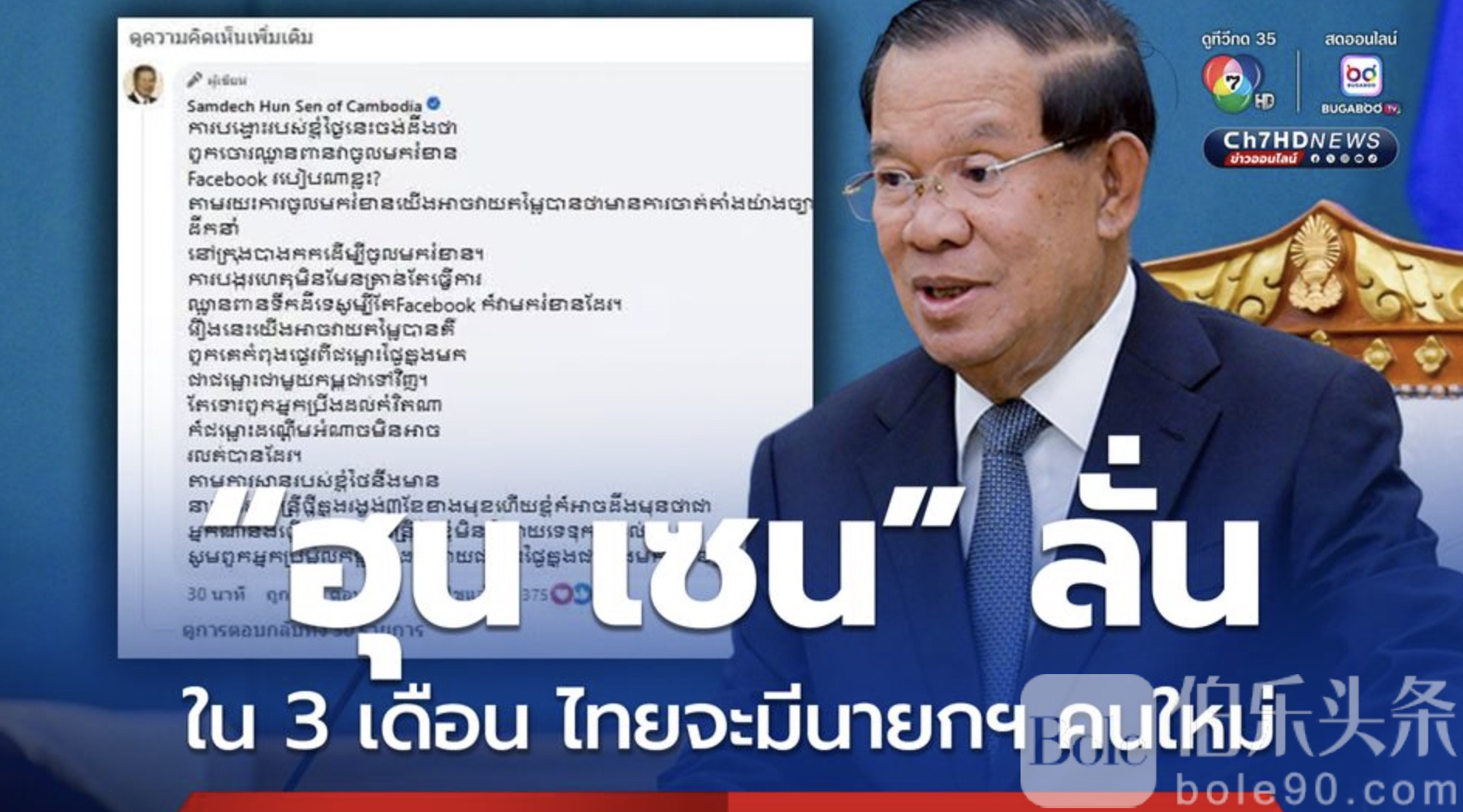 伯乐头条专讯:6月24日消息,柬埔寨参议院主席洪森再次语出惊人,在社交平台发文称“泰国将在3个月内迎来新总理”,并表示自己早已知道是谁,但“暂不便透露”。此言一出,立即引发舆论热议,令泰国政坛气氛更加扑朔迷离。