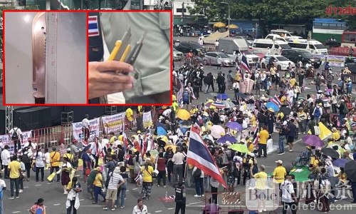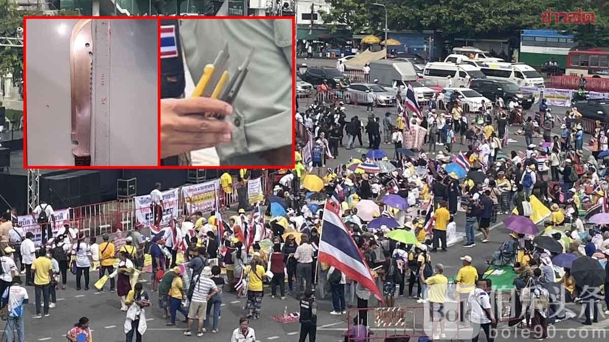 伯乐头条专讯:2025年6月28日,泰国曼谷——在当天于胜利纪念碑举行的“保卫泰国主权”集会前,警方加强安全检查,扣押了一把斯巴达刀和三把美工刀,并控制携带者。警方共计部署四个连的人员,超过两千人负责现场周边安保工作,并设立五个检查点,配合移民局筛查境外人员。