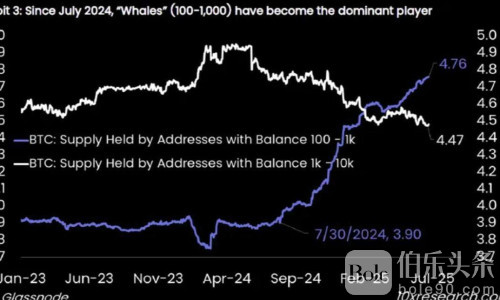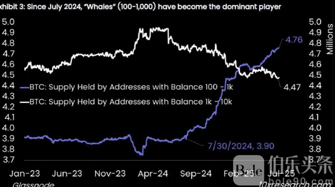 伯乐头条专讯:比特币市场正经历深度洗牌。据链上数据统计,在过去一年内,大户投资者已累计抛售超过50万枚比特币,估算市值高达500亿美元,显现出鲸鱼资金持续流出的趋势。而与此同时,ETF、企业和资产管理机构却悄然吸纳了近90万枚比特币,市场主导权正逐步由个人和大户向机构资本集中转移。