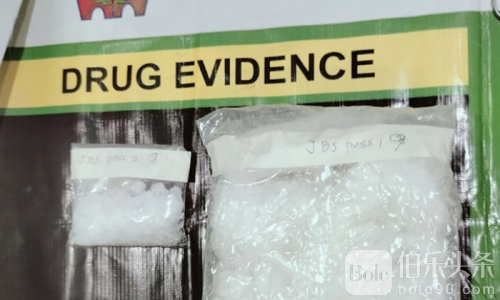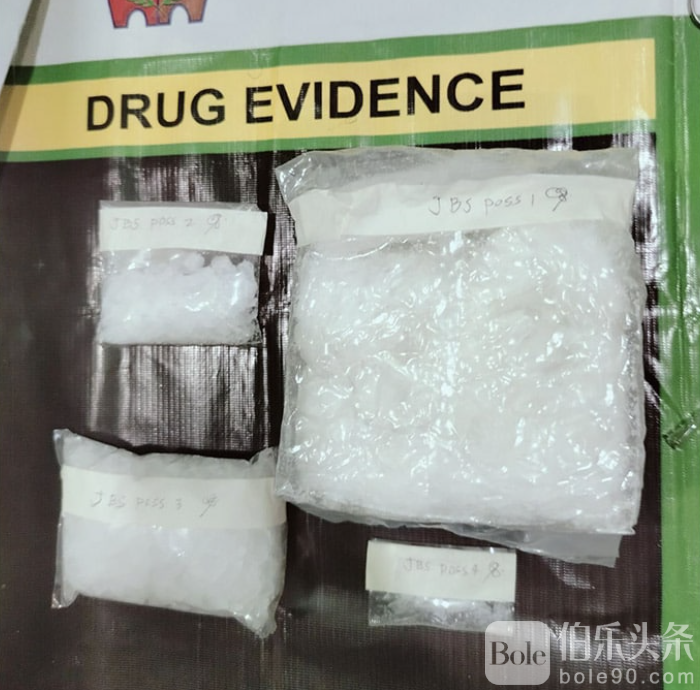 警方随即在嫌疑人随身携带的吊带袋中发现两个塑料袋,内含共计90克白色结晶状物质,疑似为冰毒。