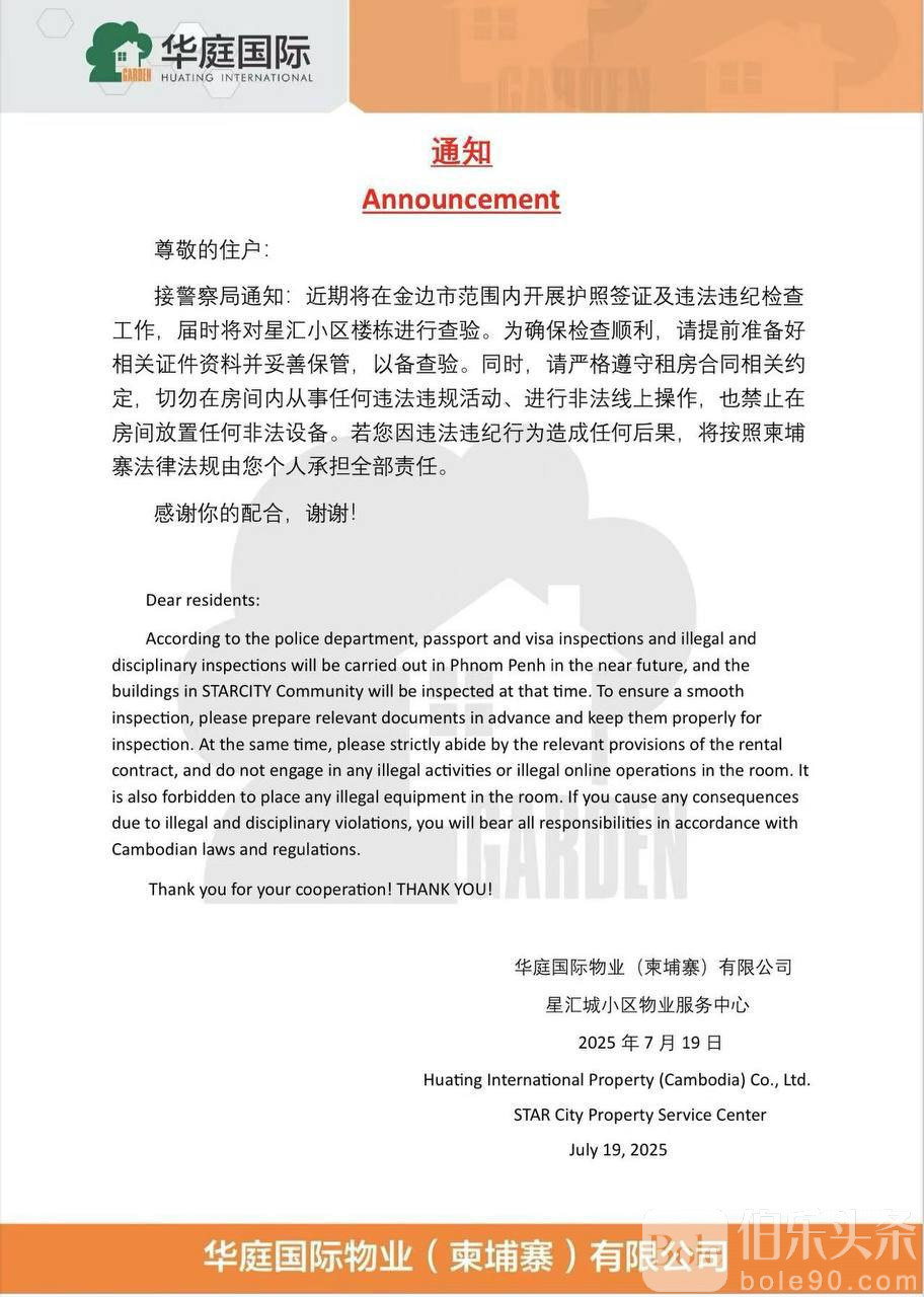 与此同时,有消息称西港“中国城”区域今日(7月19日)下午已经有执法人员开展排查。当地一些公寓也提前向住户发出通知,提醒外出务必携带护照及相关证件,避免被检查时出现不必要的麻烦。
