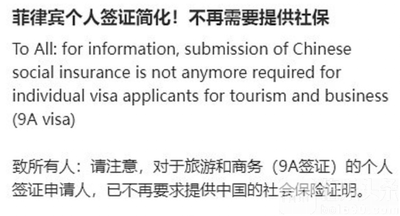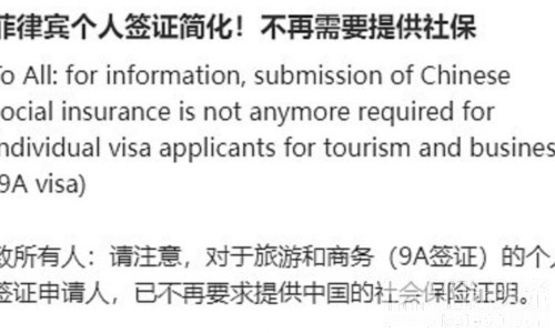 伯乐头条专讯:近日,从菲律宾驻广州总领事馆获悉,中国公民申请菲律宾旅游或商务签证(9A签证)时,不再强制要求提供中国社保证明。尽管领馆仍保留“视情况要求补充社保证明”的权利,但此次放宽,被广泛解读为签证门槛实质性下调,将大大便利无社保或社保中断人群的赴菲行程。