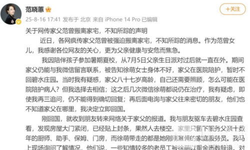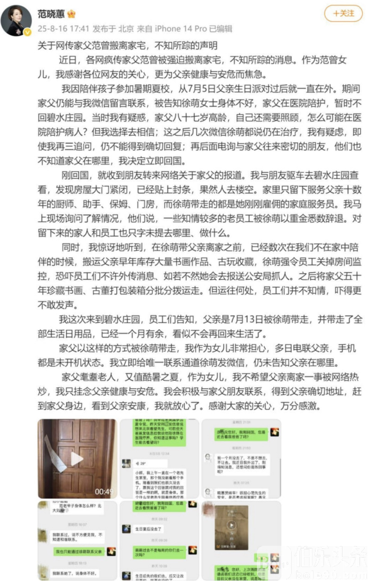 有网友爆料称,徐萌接近范曾或许早有布局。据称,她最初与范曾的继子范仲达有联系,借“孝顺与照顾”赢得信任,成功成为范宅女主人。随后,她又与范曾老乡范某华搭上,后者熟知艺术品市场,帮助变卖字画并抽取佣金。更劲爆的是,外界甚至怀疑她与这些合作对象存在不正当关系。