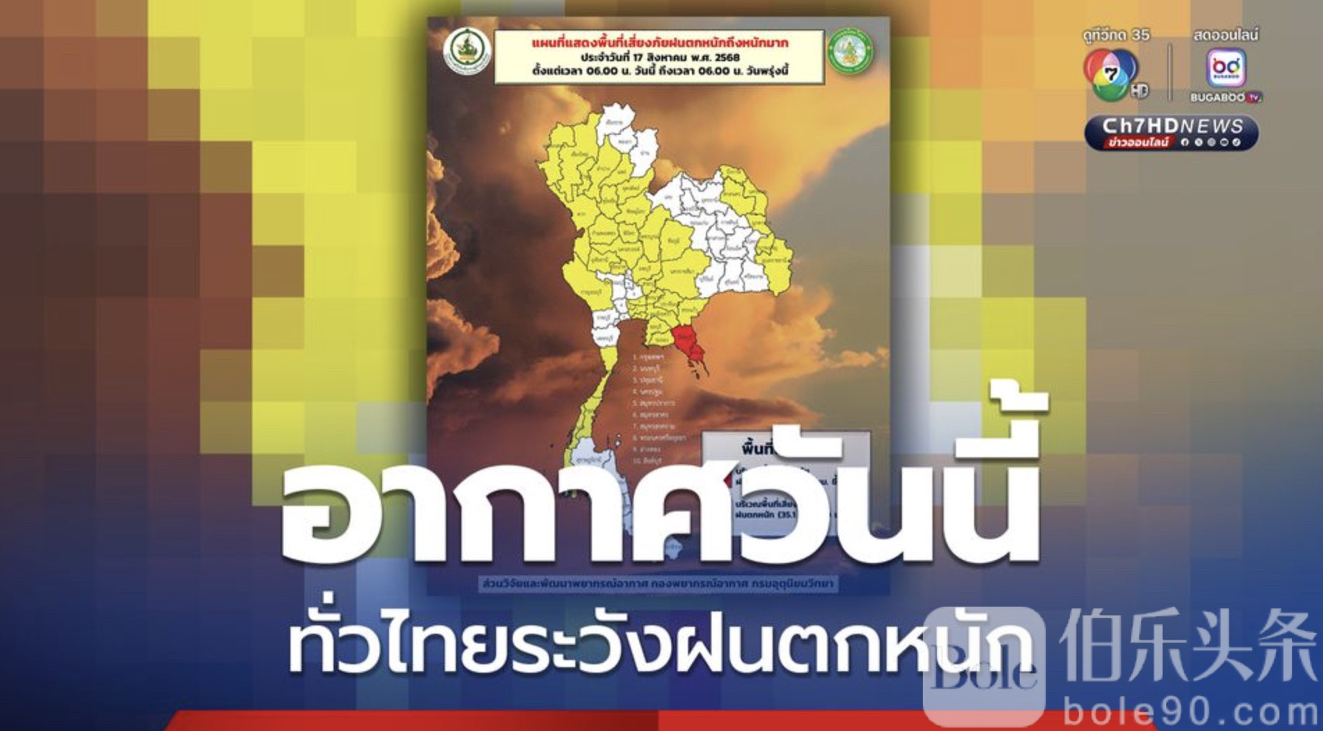 伯乐头条专讯:泰国气象局17日发布全国范围暴雨警告,预计未来24小时内,多地仍将出现强降雨和局部暴雨,尤其是东部地区雨势最为猛烈。气象局提醒公众,特别是北部、东北部及东部沿海省份居民,应高度警惕可能引发的山洪、积水及滑坡等自然灾害。