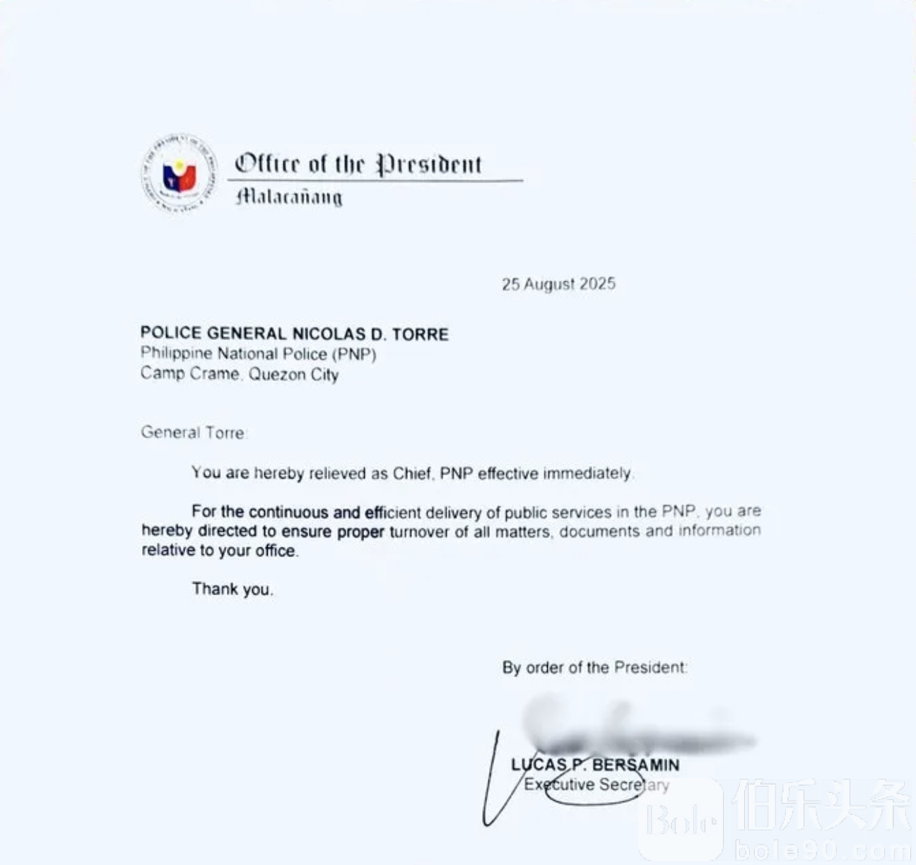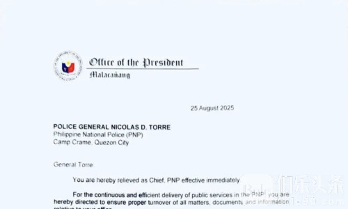 伯乐头条专讯:菲律宾总统府8月26日证实,国家警察总长尼古拉斯·托雷三世(Nicolas Torre III)被解职,由副总长何塞·纳塔特兹(Jose Nartatez Jr.)火线接任。这项命令立即生效,总统府执行秘书卢卡斯·贝尔萨明(Lucas Bersamin)已正式对外发布备忘录。