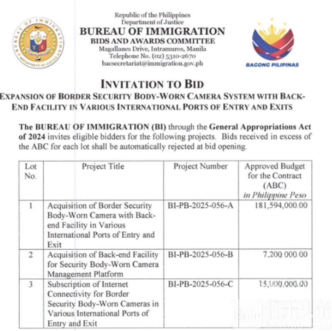 伯乐头条专讯:菲律宾移民局正加紧收紧边境管理!8月28日,移民局招标与评审委员会宣布,将斥资超过2亿比索,大规模扩充边境安保执法记录仪系统及后台设施,覆盖全国多个国际机场与港口,标志着菲律宾边境监控将进入“全方位、无死角”时代。